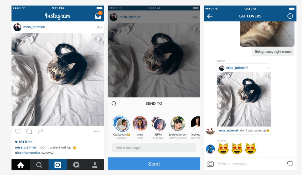 Messages show as a thread, and any person added can see the full history in the group chat. Emojis are also supported because what's a cat Insta without the cat face to reply with?